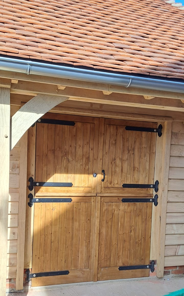 The workshop features bespoke double stable doors, carefully crafted to complement the oak frame and provide both practical access and a charming, traditional aesthetic. Every detail of this project has been considered to balance functionality, style, and longevity. The large upstairs space is perfect for storage and spans all five bays.