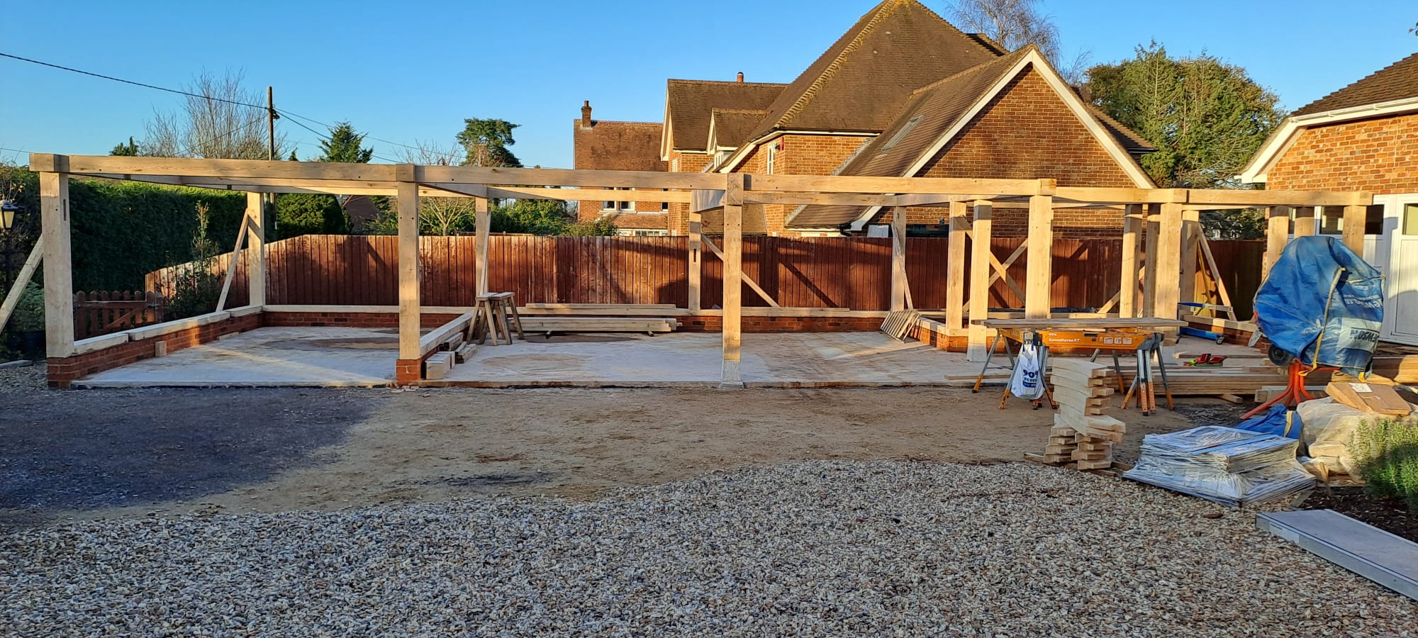 The structure features granite staddle stones on all free-standing posts, enhancing both durability and the classic aesthetic of oak frame buildings.
