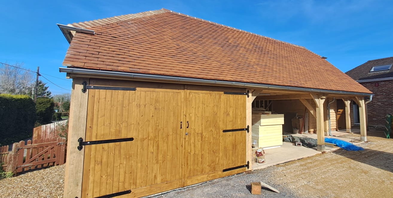 This bespoke 5-bay oak-framed garage and workshop, located in West Grimstead near Salisbury, has been carefully designed to combine practicality with traditional craftsmanship.